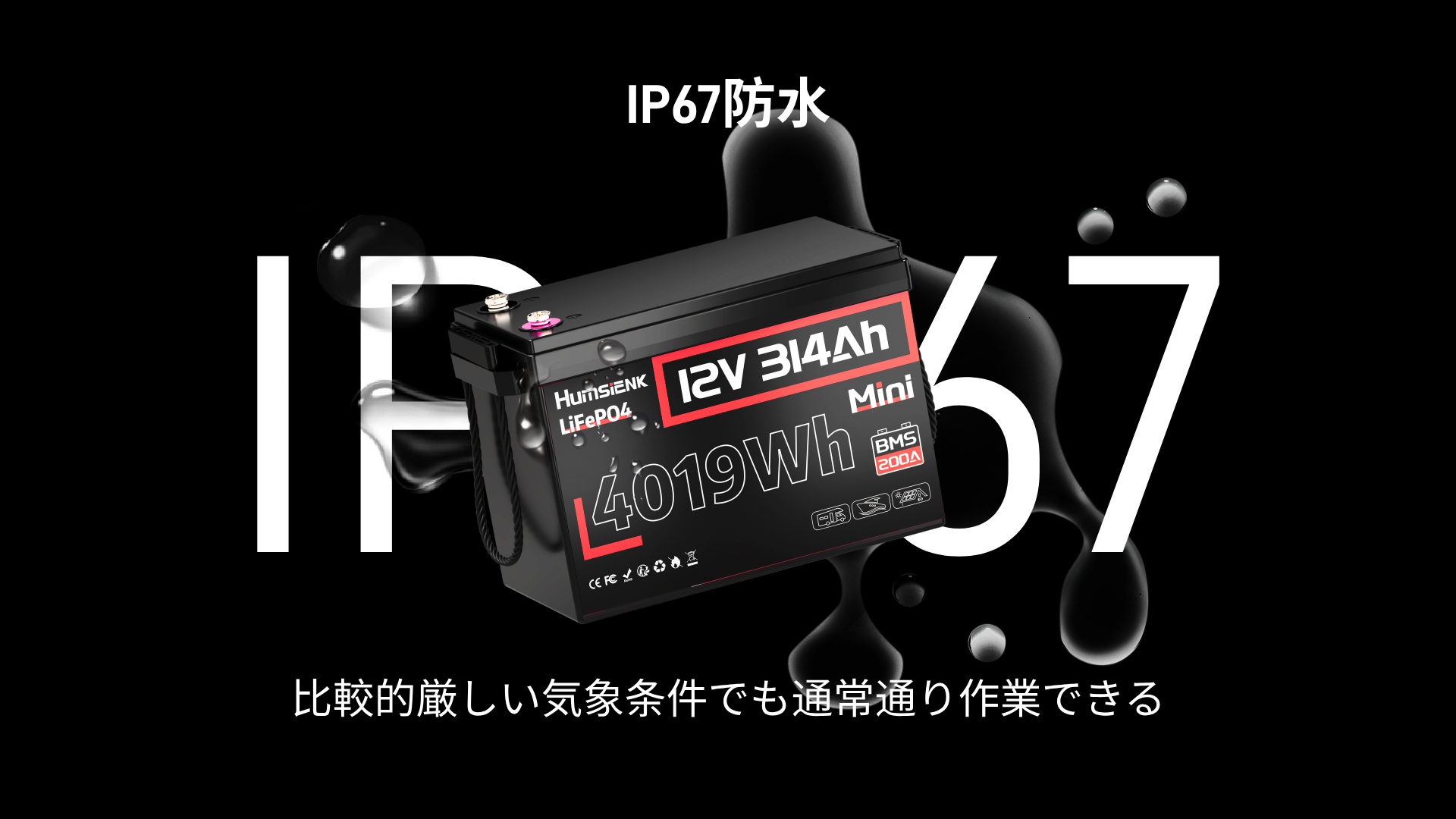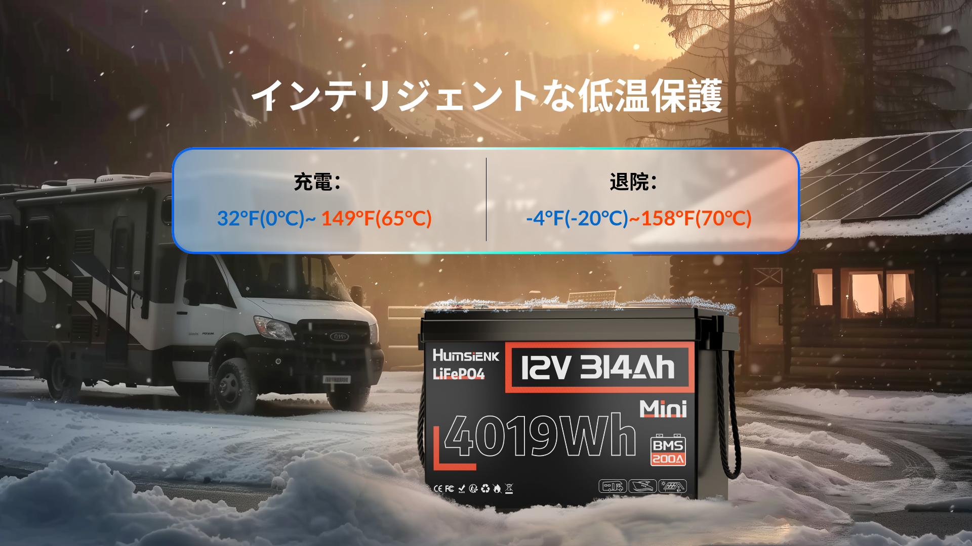 • 安全&メンテナンスフリー:200A BMS(過保護機能)、高温/低温カットオフ機能、屋内/屋外使用可能。
