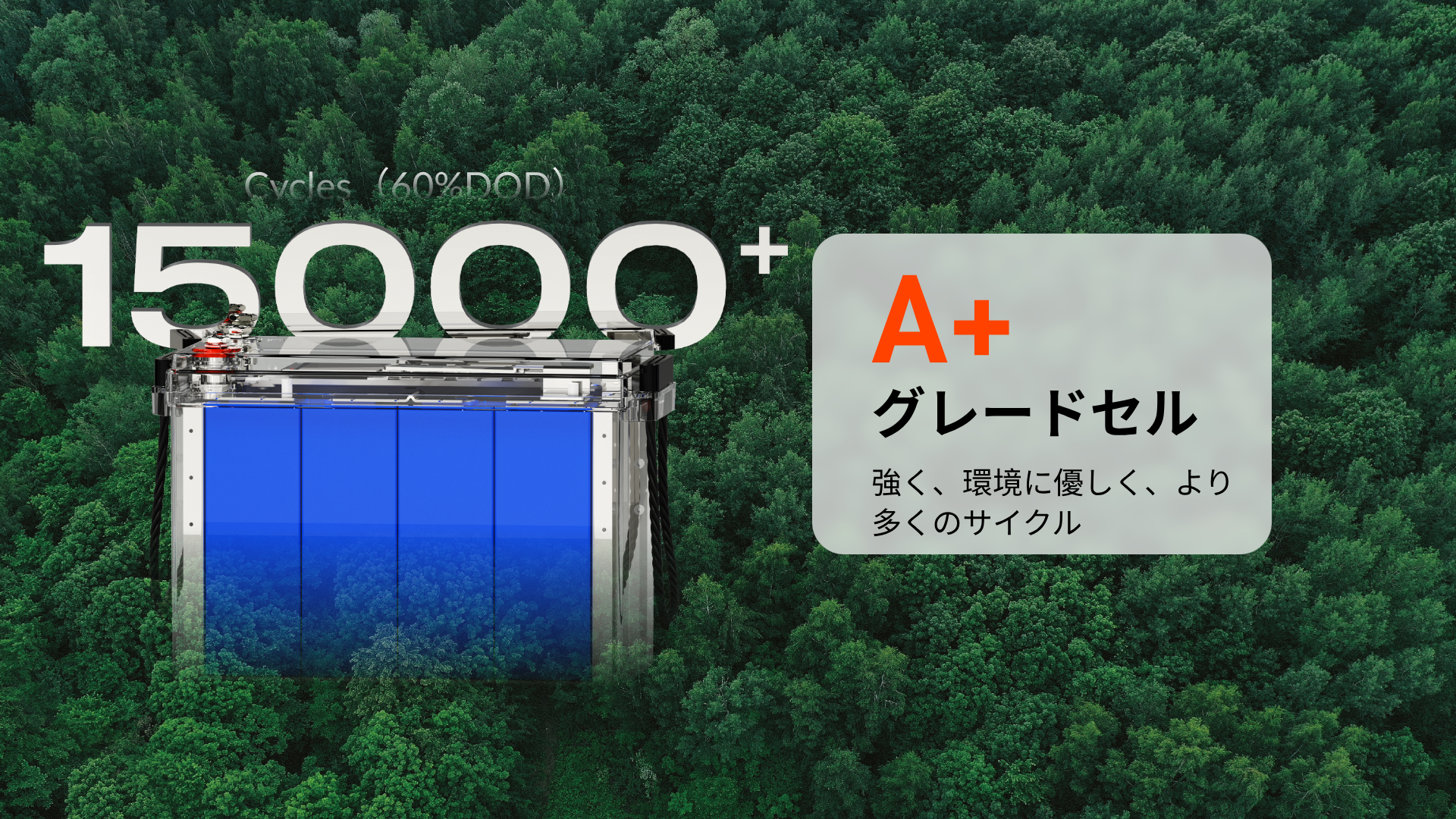• 長寿命&高容量:15,000回以上のディープサイクル(鉛蓄電池の30倍)、4.019kWhのエネルギー、100% DOD。