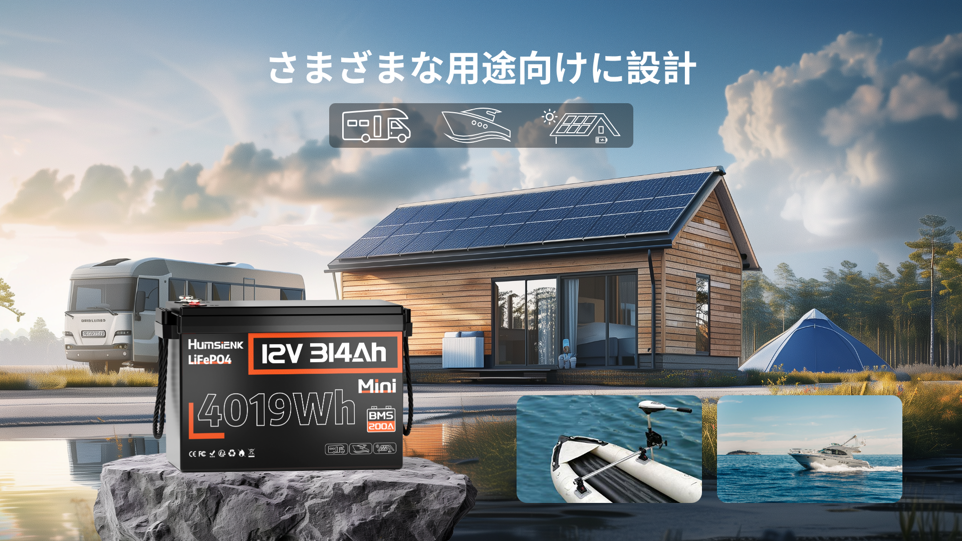 • 多用途:家庭用蓄電池、UPS、RV、太陽光発電システム、ゴルフカート、CCTVなど。
